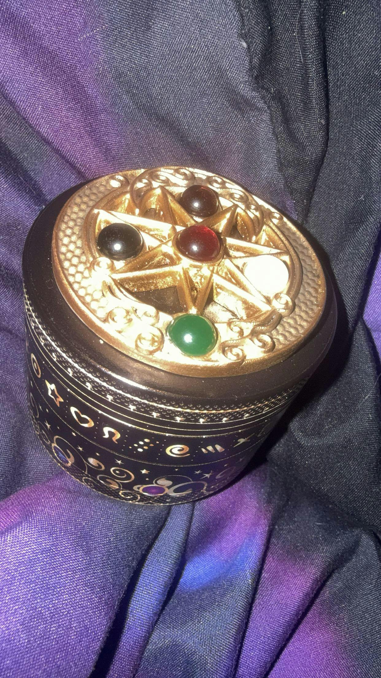 - A classic aluminum grinder featuring a 3D design at the top with real gemstones and a fortune reading print on the sides