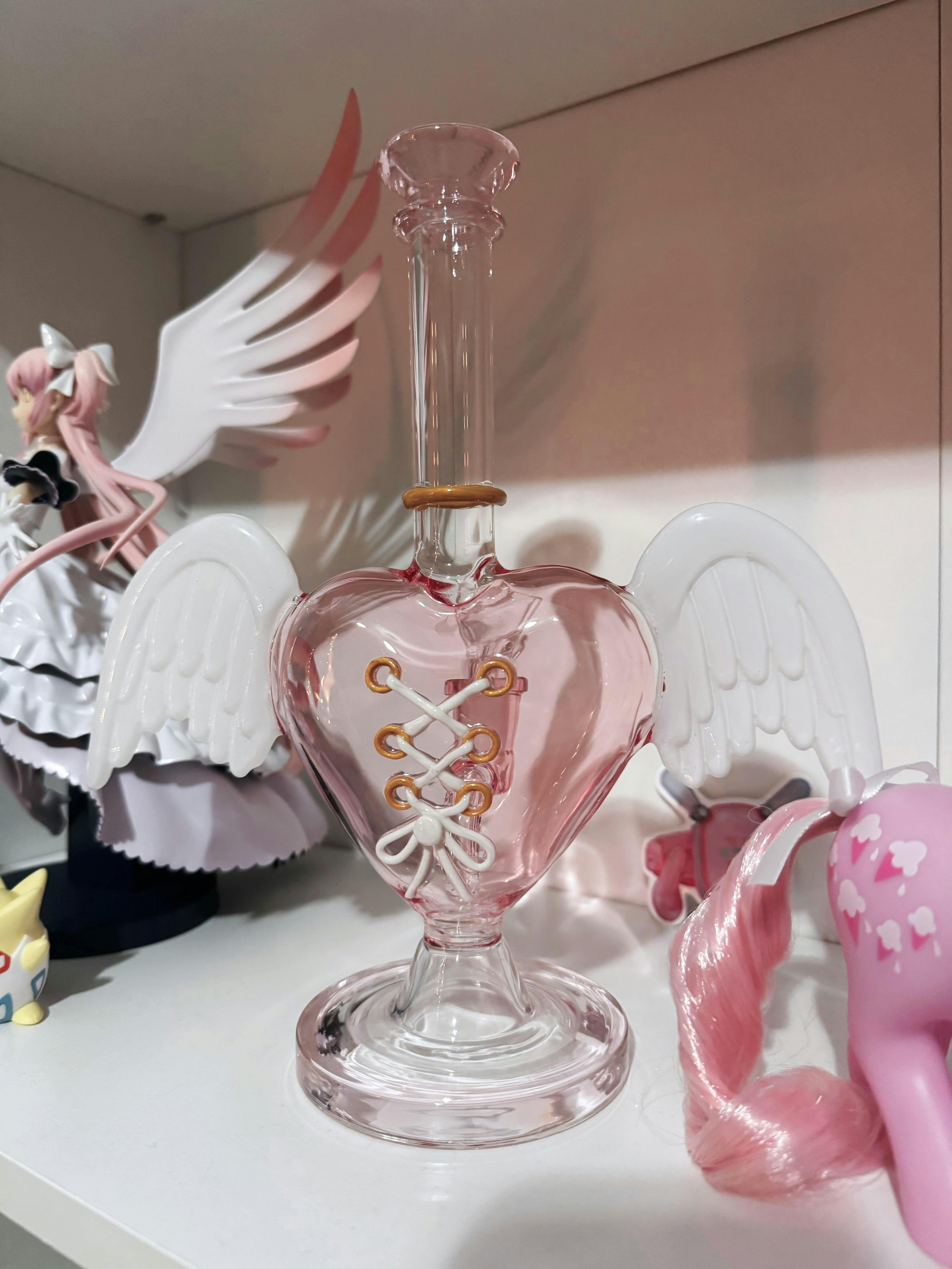 - This handcrafted bong is intricately designed including glass angel wings and clay halo & corset details