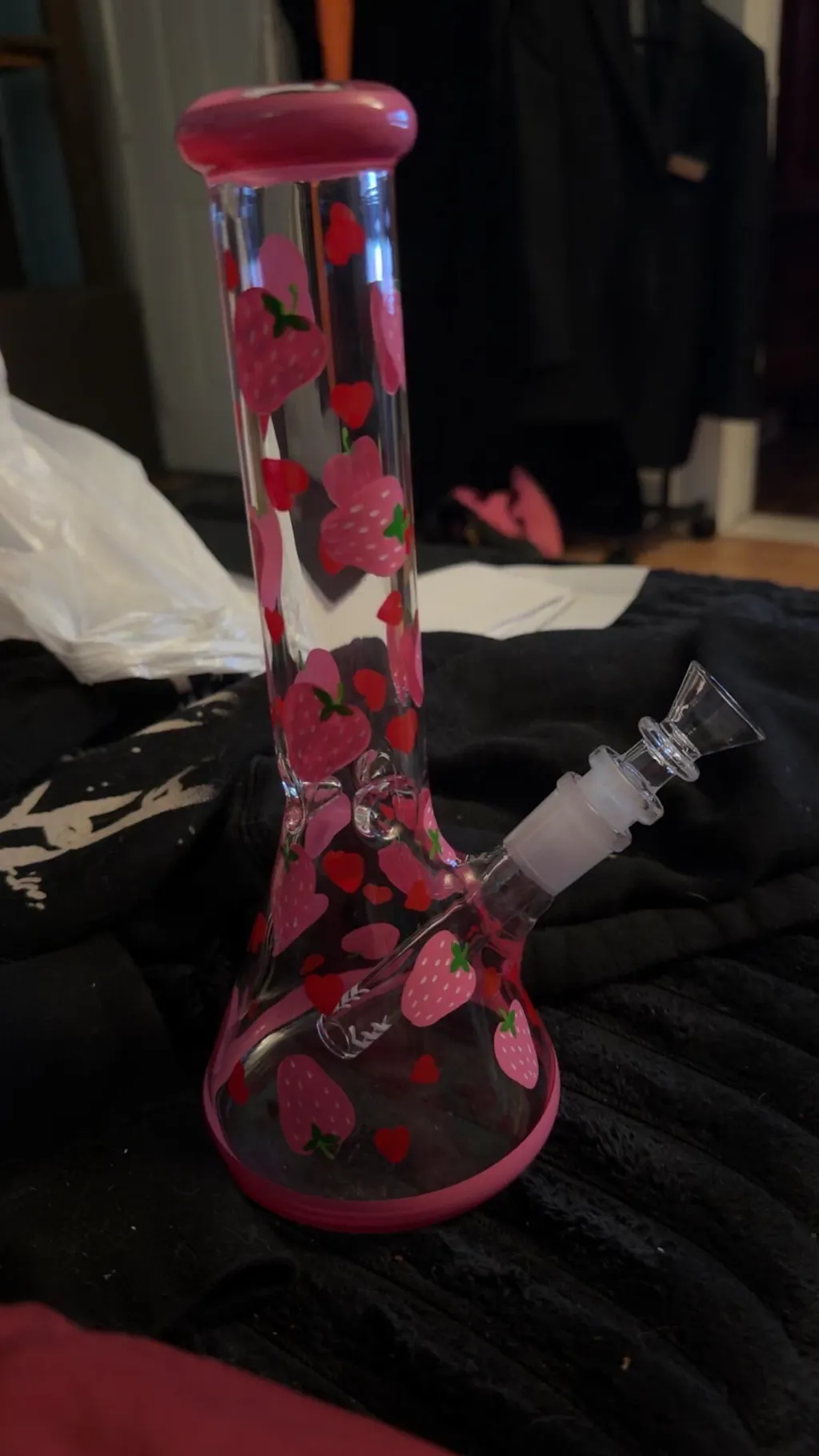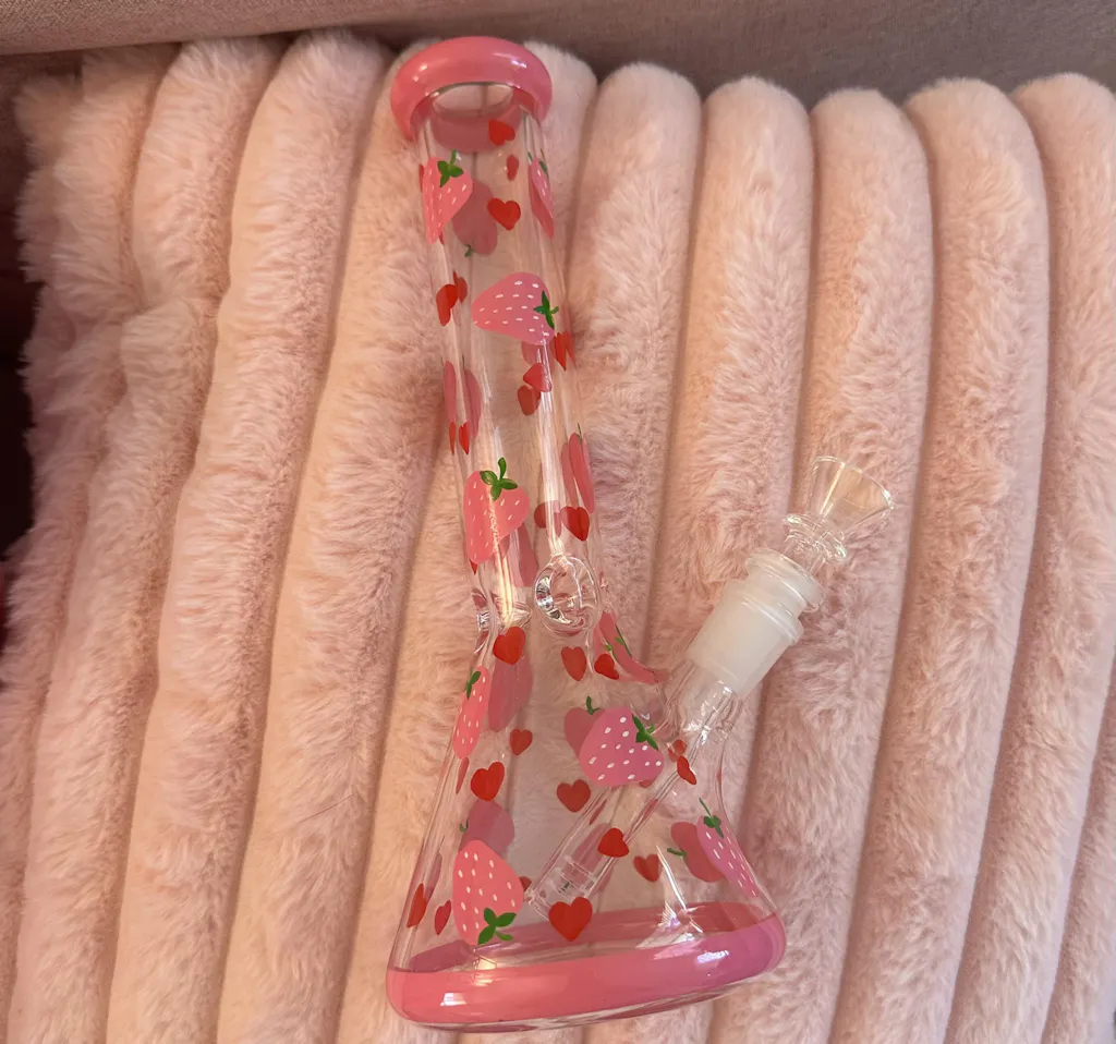 - This bong is adorned with adorable hand-painted pink strawberries and red hearts