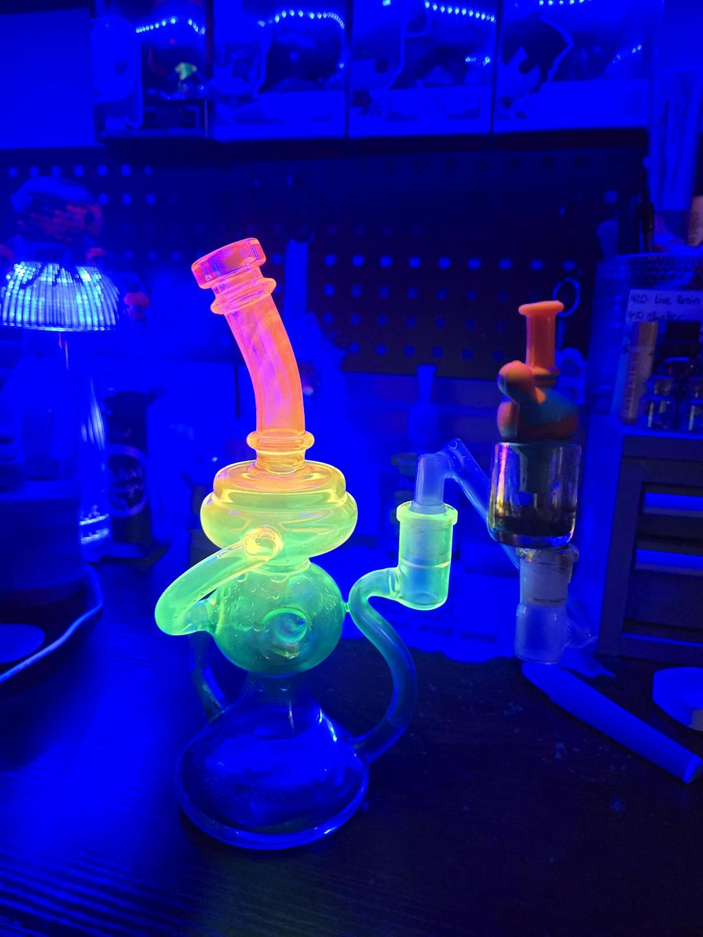 - Made of glass with a neon gradient rainbow translucent finish. The pink and yellow color are uv reactive