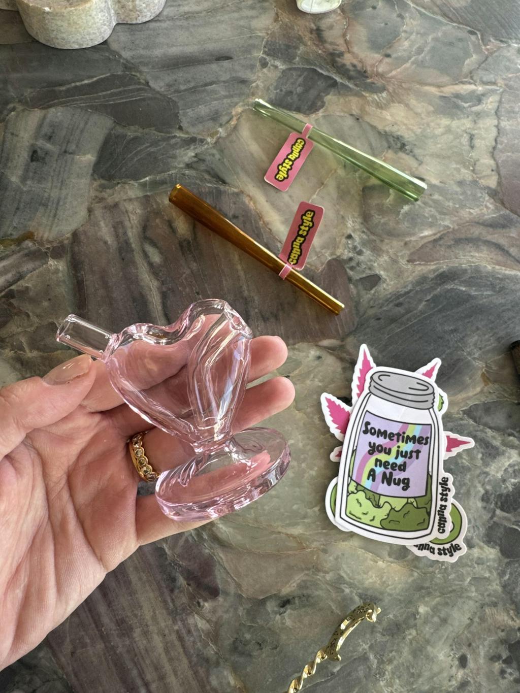 - This adorable piece is a cross between a mini bong and pipe, providing smoother puffs for joint lovers